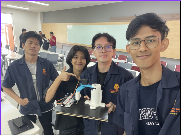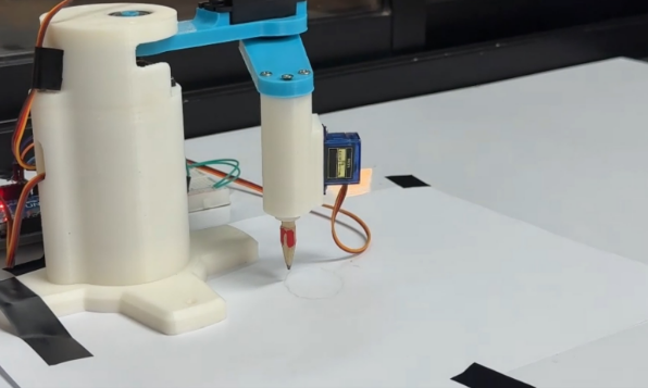 A 3 Degree of Freedom (3DOF) robot arm with drawing capability, using three servo motors for movement and controlled by an Arduino UNO. The project demonstrates basic automation by drawing shapes such as circles, stars, and hearts.